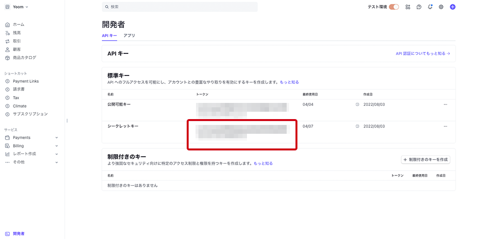 開発者<APIキー< シークレットキーの値が「アクセストークン」に該当します。コピーして、Yoomの画面のアクセストークンの編集欄にペーストします。