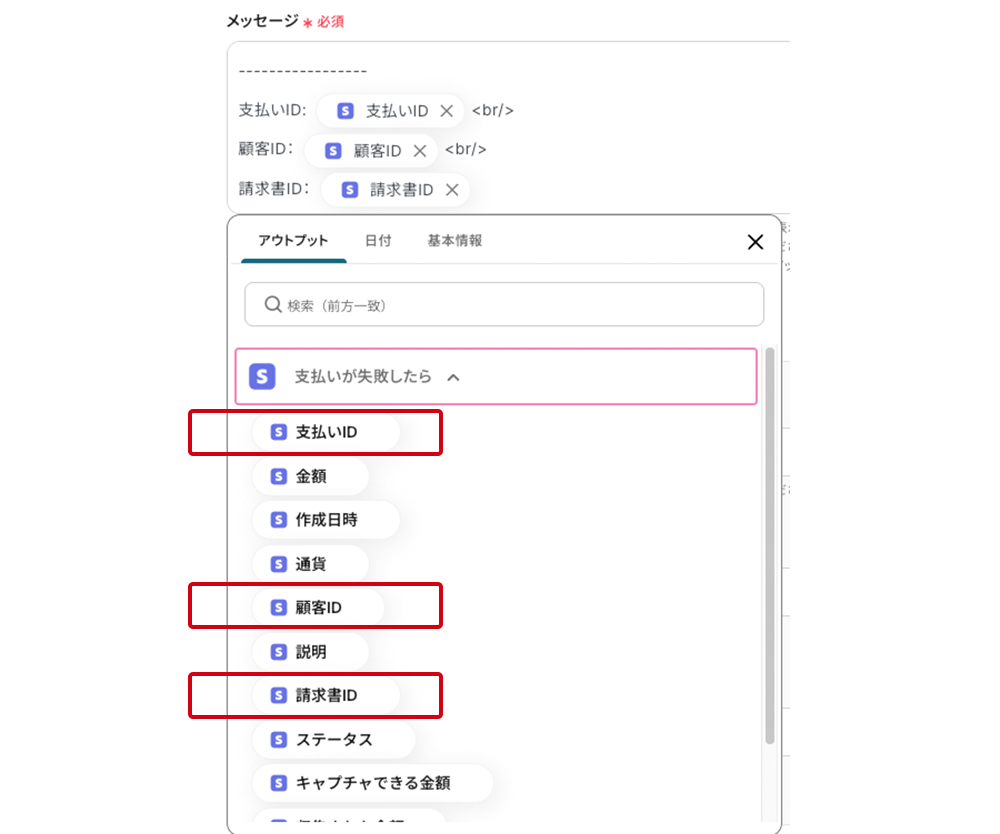 - 編集欄をクリックして、Stripeで取得した値を引用しながら定型文を作成します。事前設定では、支払いID、顧客IDの引用コードが埋め込まれています。このコードは、編集欄をクリックして表示されるプルダウンメニュー<アウトプット の中に格納されています。選択すると編集欄に埋め込まれる仕組みです。
