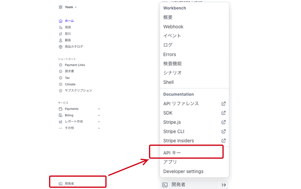 管理画面の左のメニューバーの一番下にある「開発者」という項目を開きます。(画像左)開くと、開発者向けのメニュー一覧が開きます。(画像右)その中のAPIキーをクリックします。
