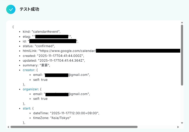テストに成功すると、Googleカレンダーに作成された予定に関する情報が表示されます。