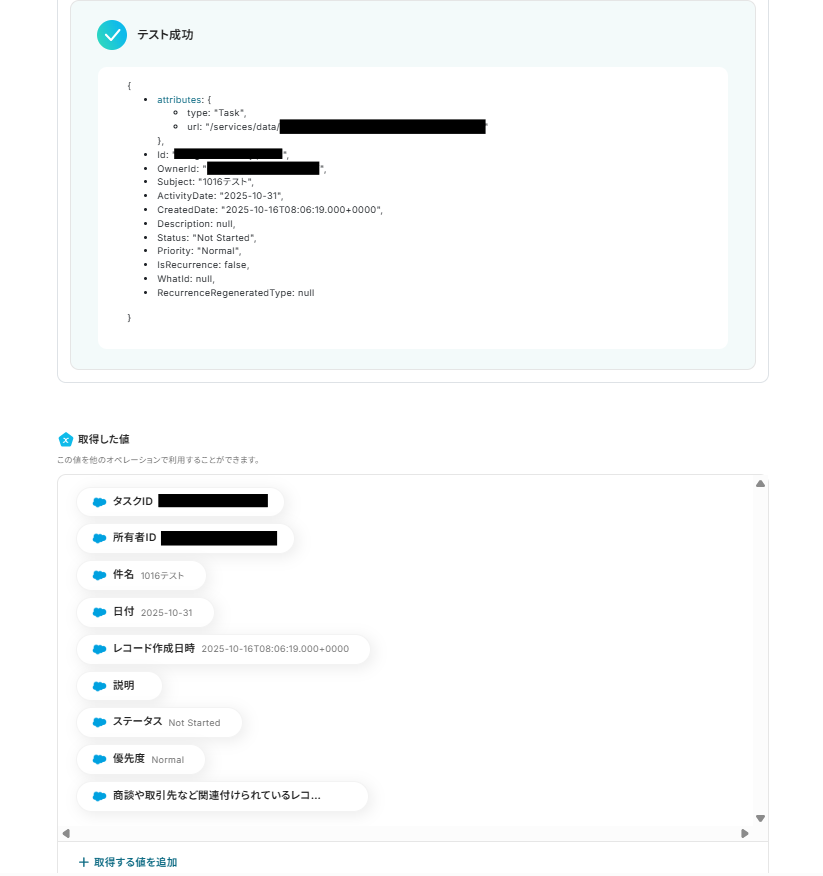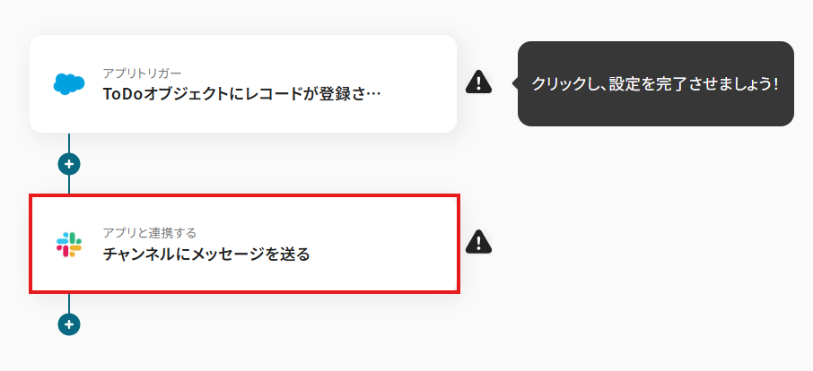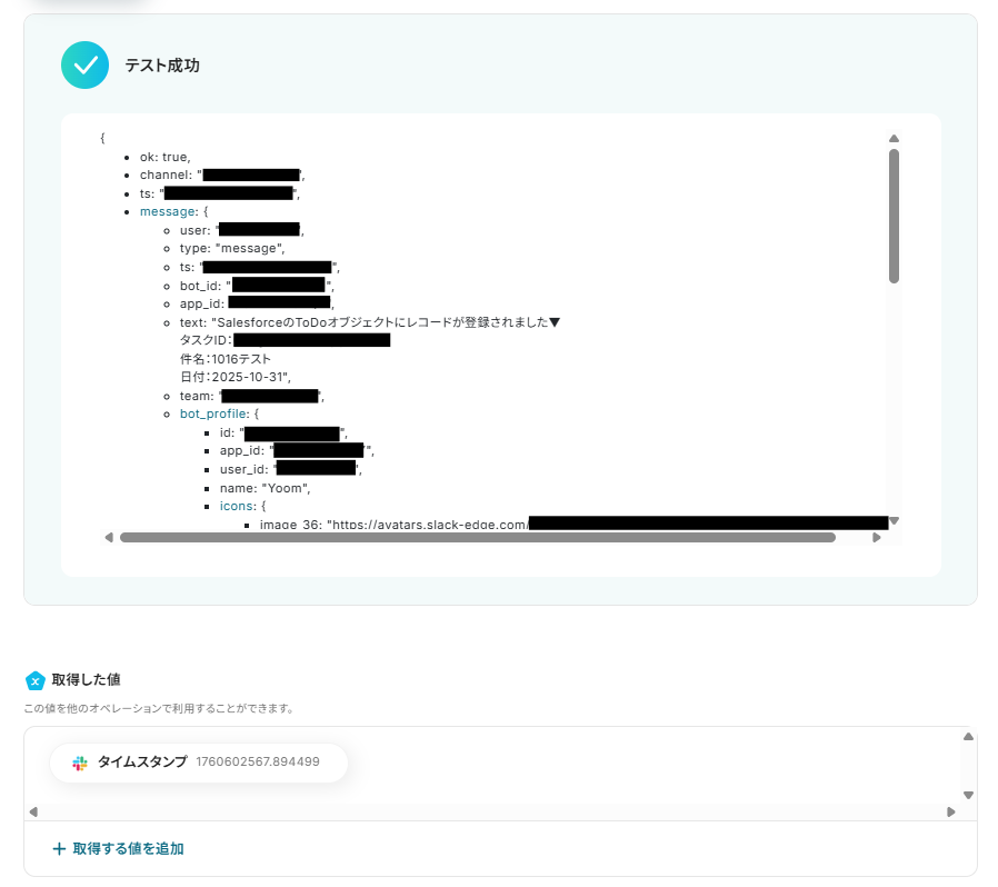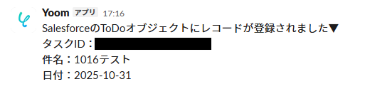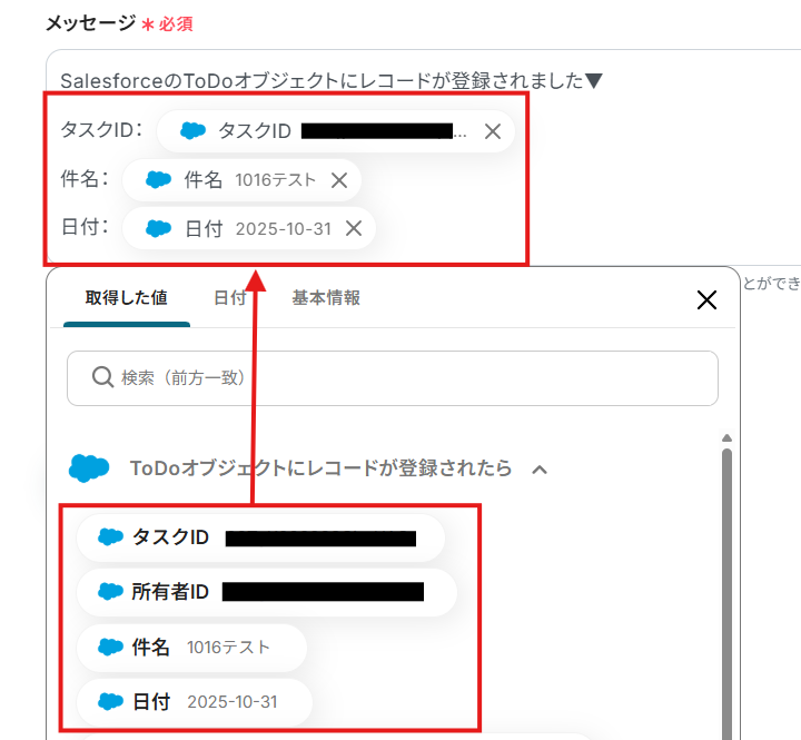 ※固定値で設定すると、毎回同じ内容が通知されてしまいます。今回の「SalesforceのToDoオブジェクトにレコードが登録されました▼」などの文は固定値で設定しても大丈夫ですが、それ以外は、取得した値を設定するようにしましょう。
