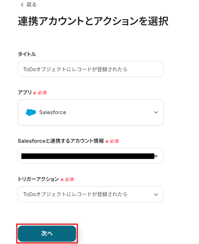 連携するアカウント情報には、ステップ1で連携したアカウント情報が反映されています。トリガーアクションはそのままにして、「次へ」をクリックしてください。