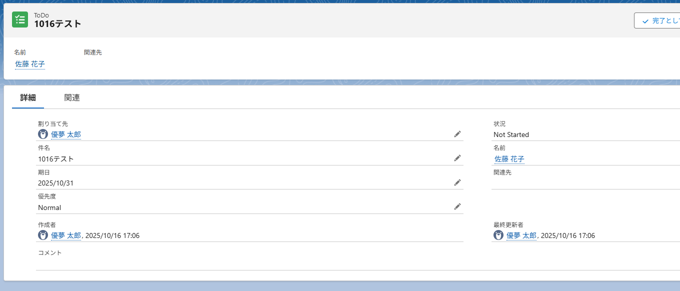 フローの作成を始める前に、あらかじめYoomと連携するSalesforceに、ToDoオブジェクトのレコードを登録しておきましょう!