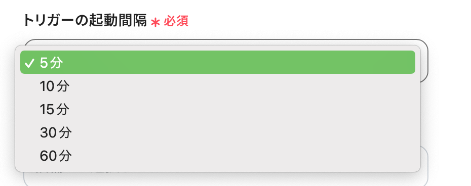 ・トリガーは5分、10分、15分、30分、60分の間隔で起動間隔を選択できます。