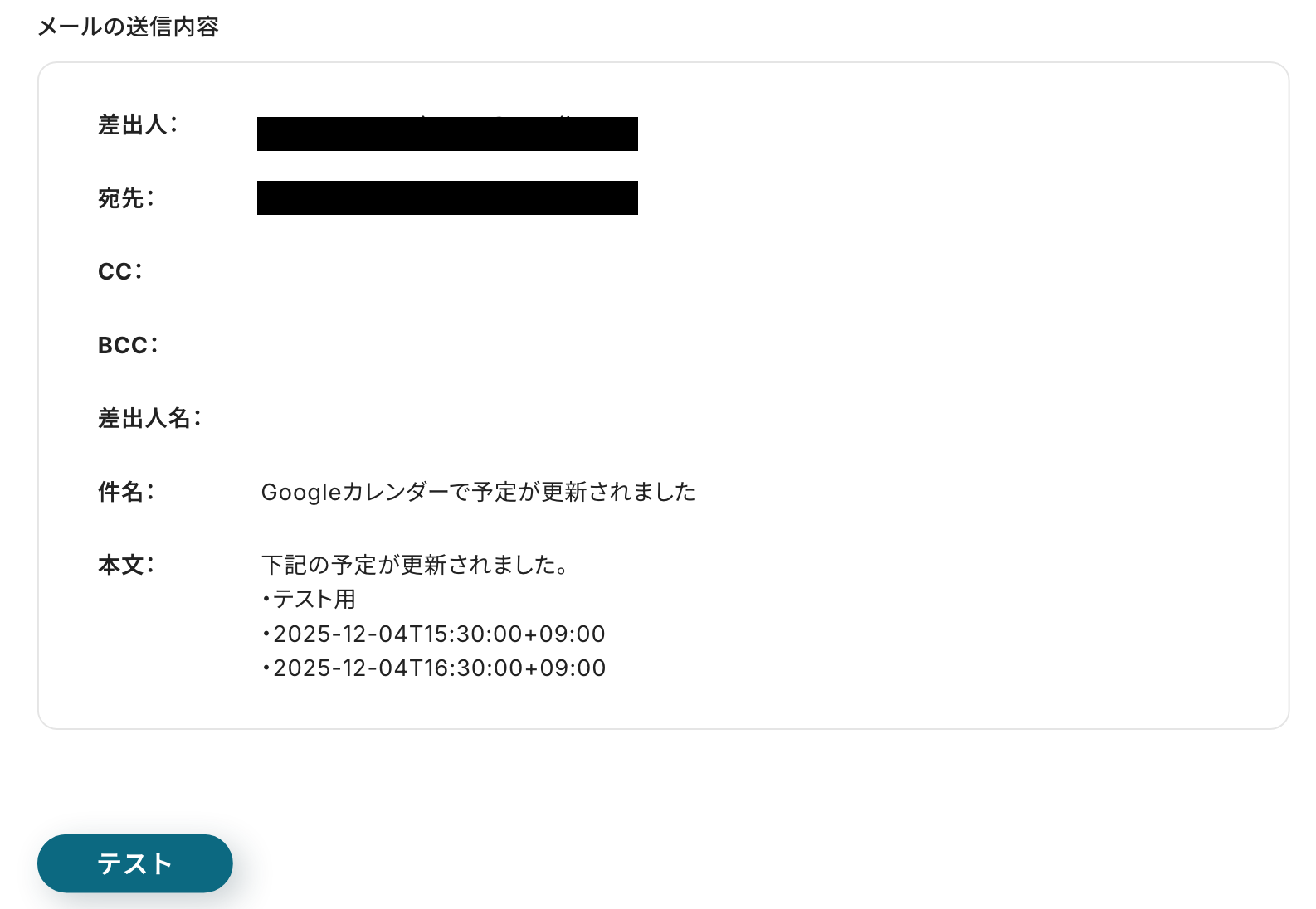 宛先と本文に間違いがないかを確認し、「テスト」をクリックします。
