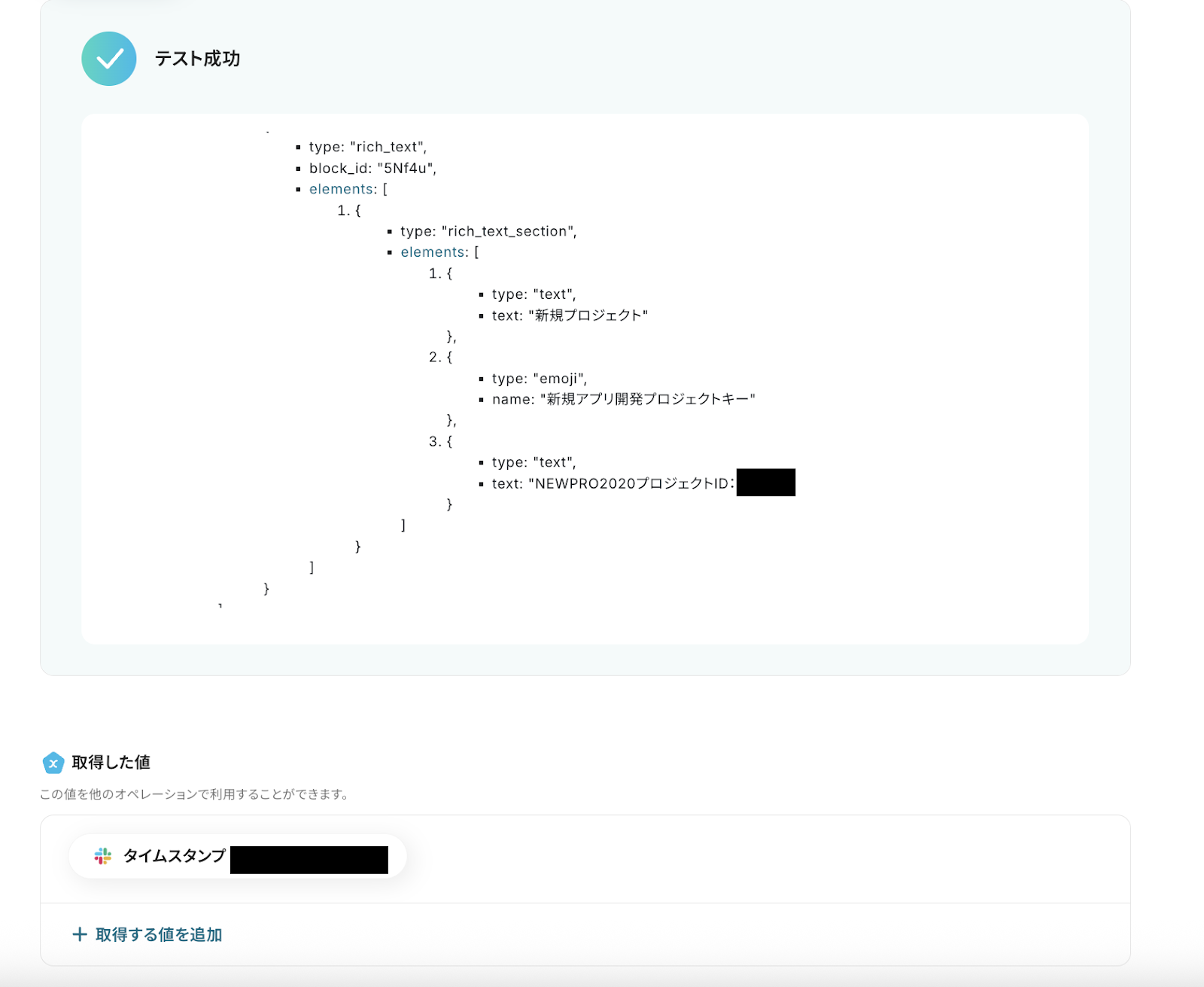 Backlogの取得した値から「プロジェクトID」などを選択しておくと、SlackからBacklogの情報を確認できます。