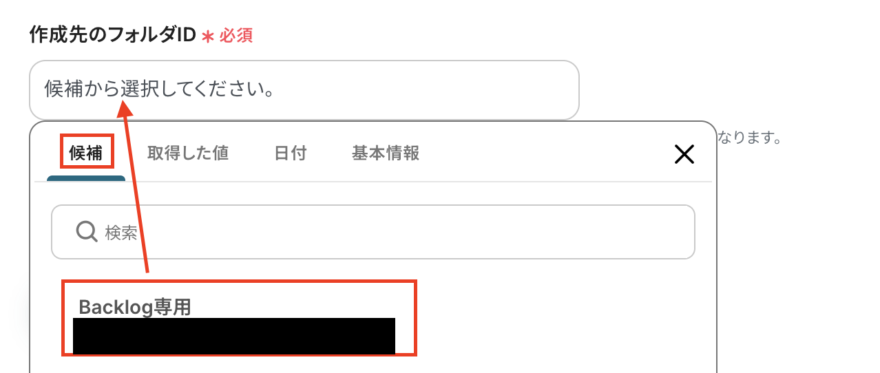 作成先のフォルダIDは、親ファイルとなるファイル名を候補から選択してください。
