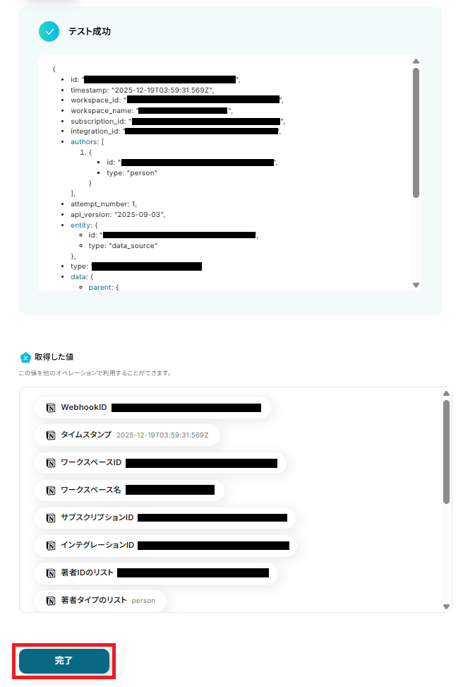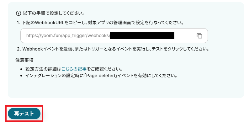 完了したらYoomに戻り「再テスト」をクリックしてください。