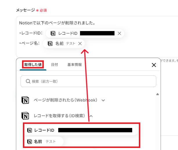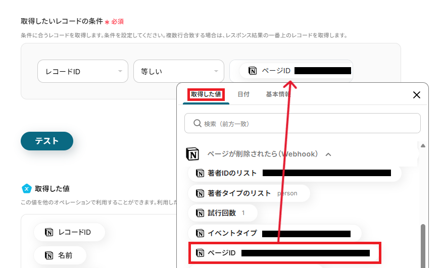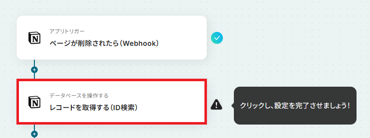 - 次に、オペレーションでNotionの「レコードを取得する(ID検索)」アクションを設定し、削除されたページに関する情報を取得します。