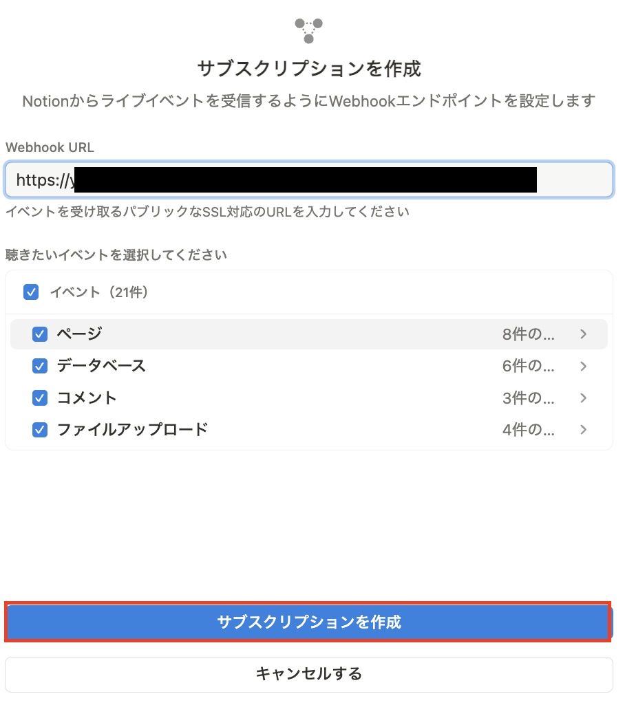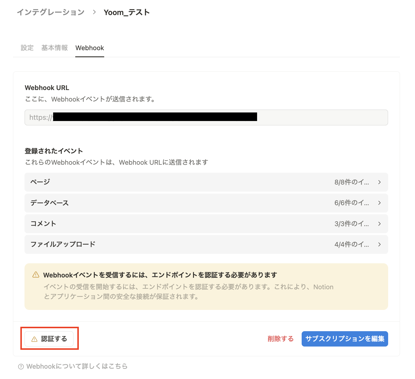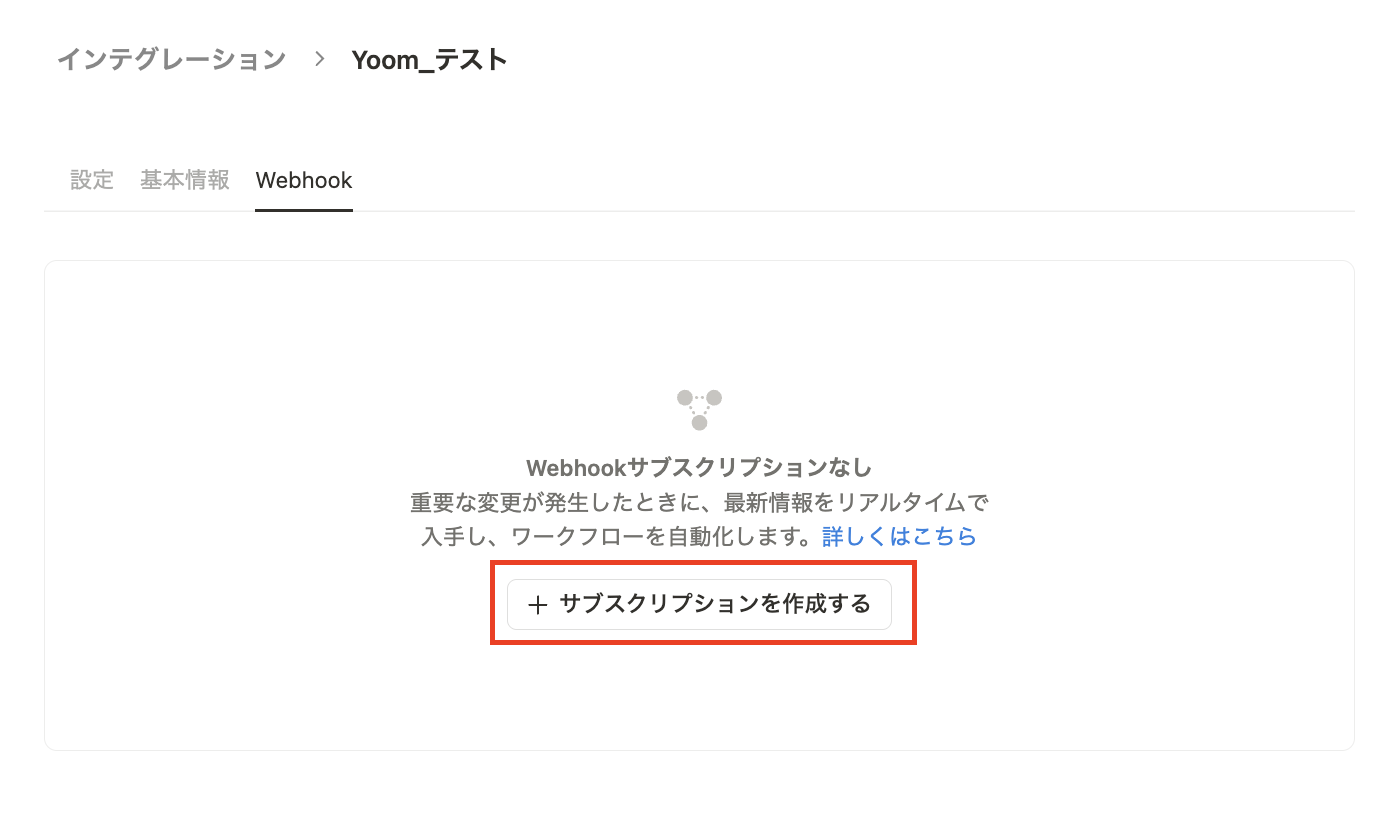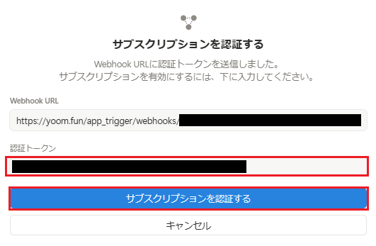 「Webhook URL」にYoom画面でコピーしたURLを貼り付けて、「サブスクリプションを作成」をクリックします。
