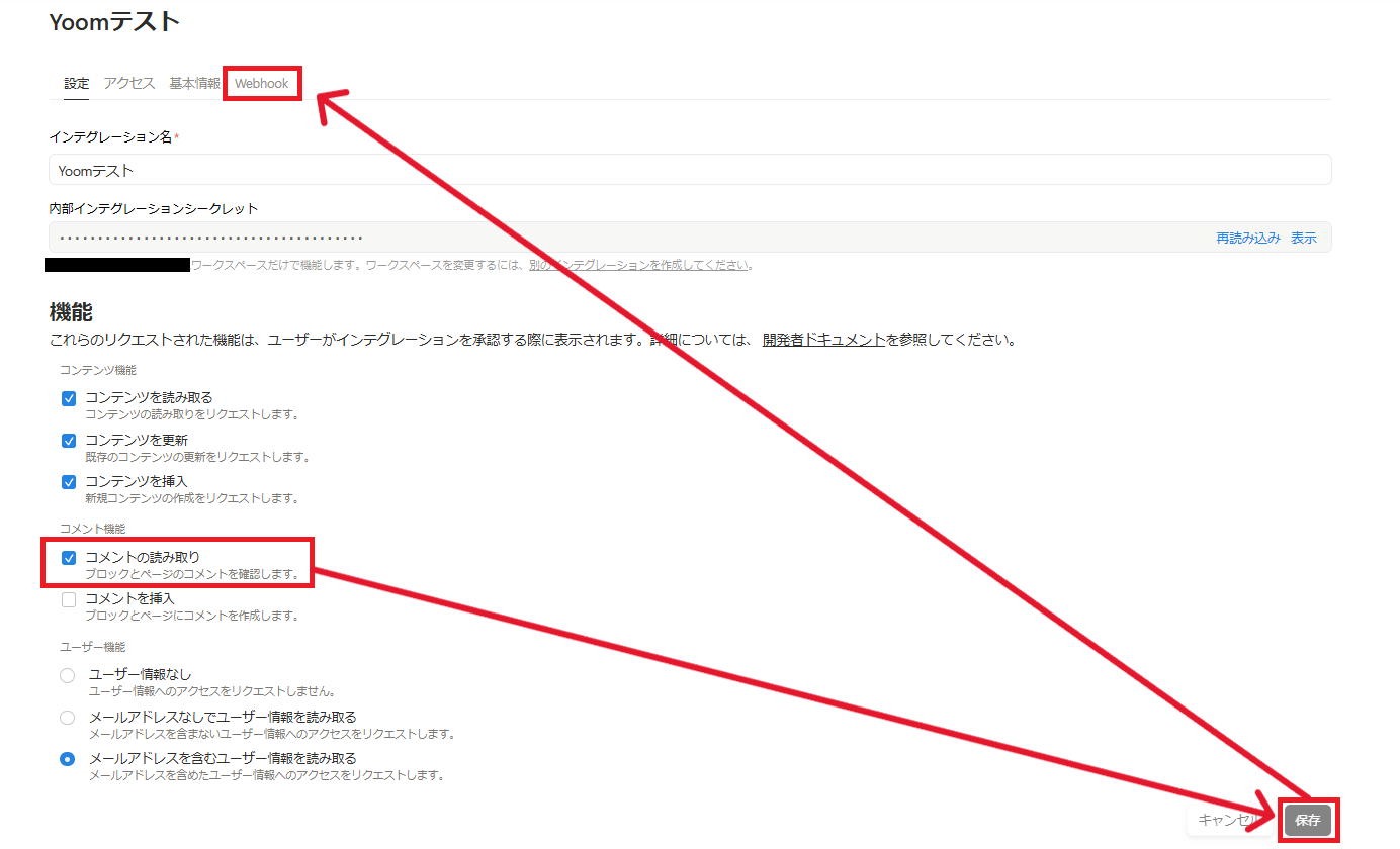 機能設定のチェック項目の中にある「コメントの読み取り」にチェックを入れて「保存」し、「Webhook」タブに移動します。