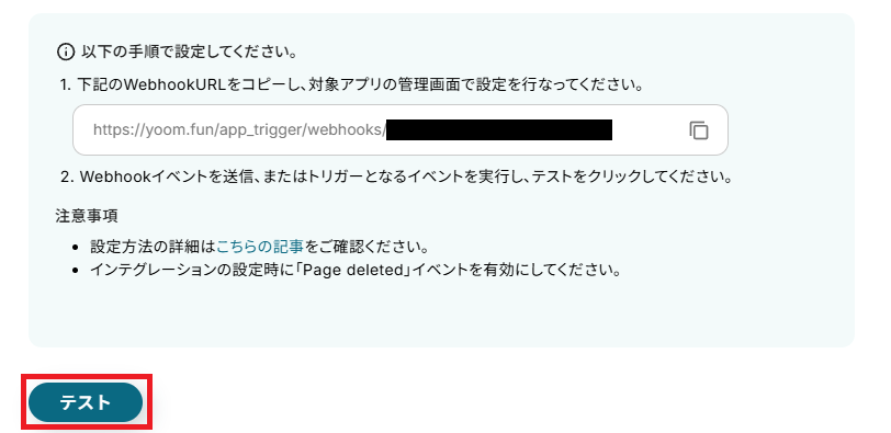 Webhookの設定が完了したら、一旦Yoomの画面に戻って「テスト」をクリックしてください。
