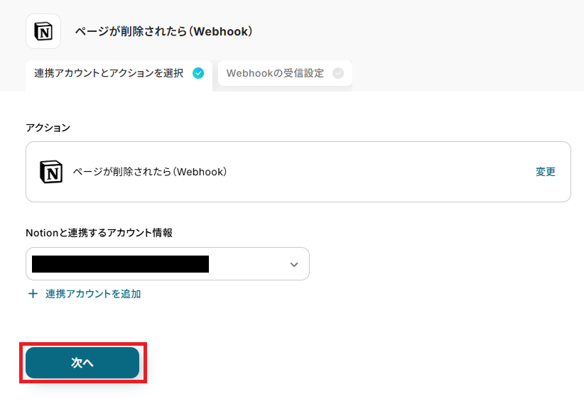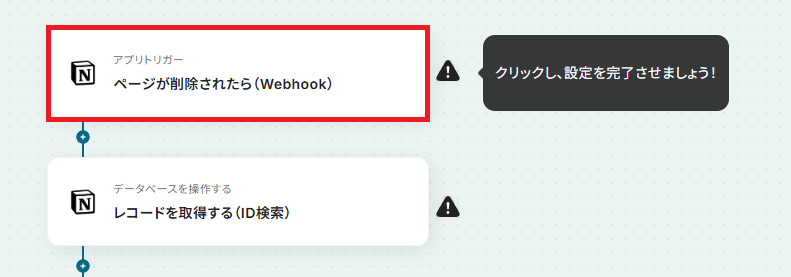 - 次に、トリガーでNotionを選択し、「ページが削除されたら(Webhook)」というアクションを設定します。