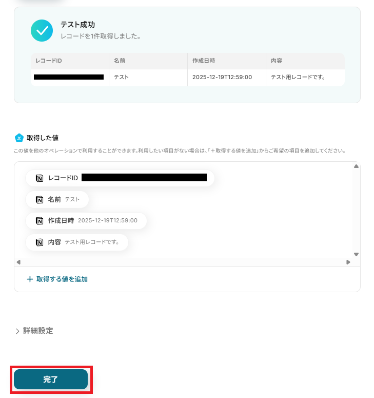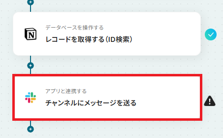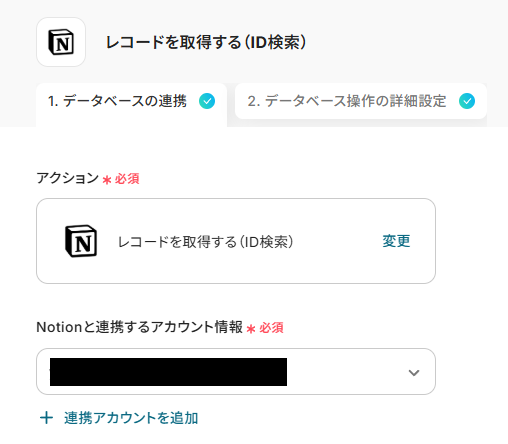 - オペレーションでNotionの「レコードを取得する(ID検索)」アクションを設定し、トリガーで取得したIDを元に、より詳細なレコード情報を取得します。