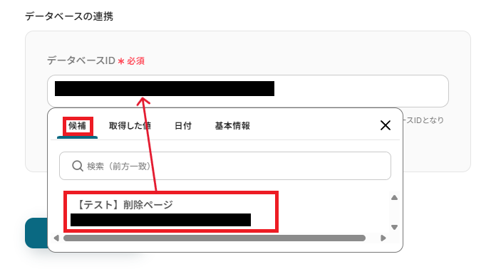 「データベースID」は、入力欄をクリックして表示される候補から、レコードを削除したデータベースを選択してください。