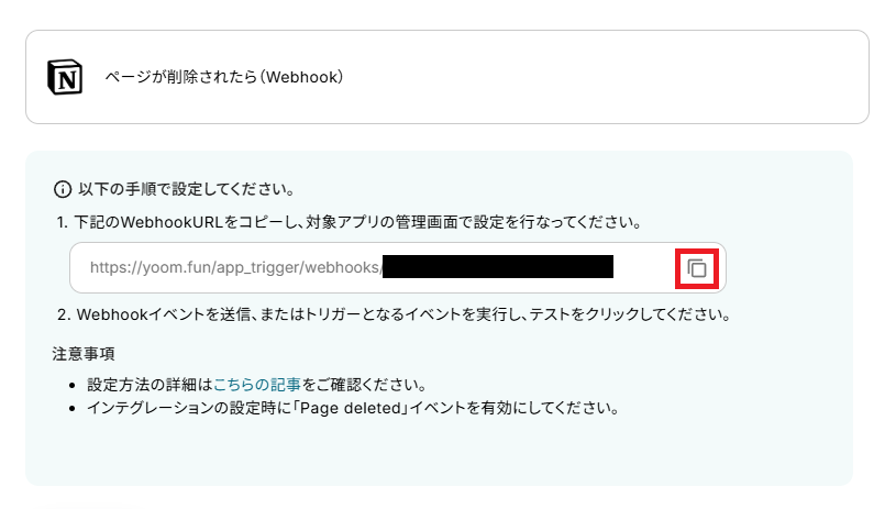 設定はNotionの画面で行うので、下記のWebhookURLをコピーしてください。