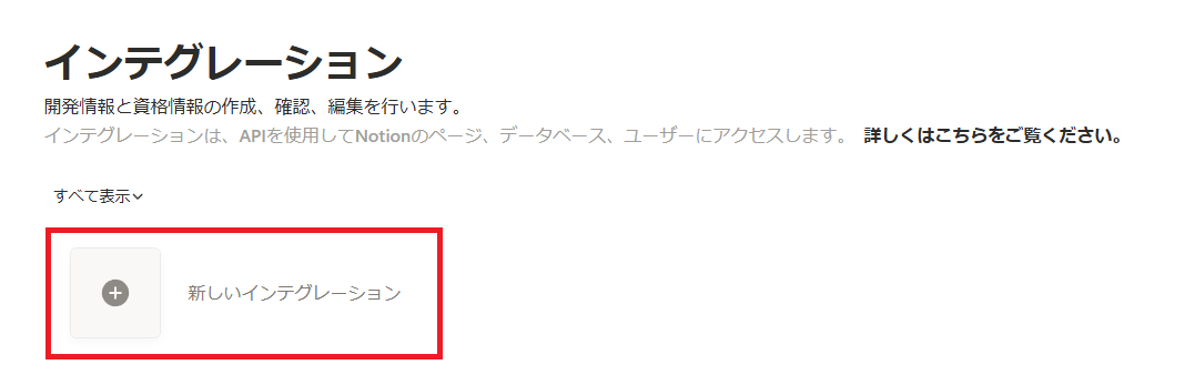 Notionのインテグレーションページにアクセスし、「新しいインテグレーション」をクリックしましょう。