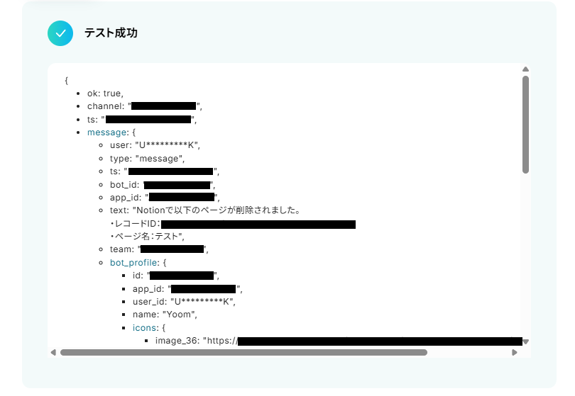 - 通知メッセージの本文は自由にカスタマイズが可能です。Notionのトリガーで取得した削除ページのタイトルなどの情報を含めることで、より分かりやすい通知を作成できます。