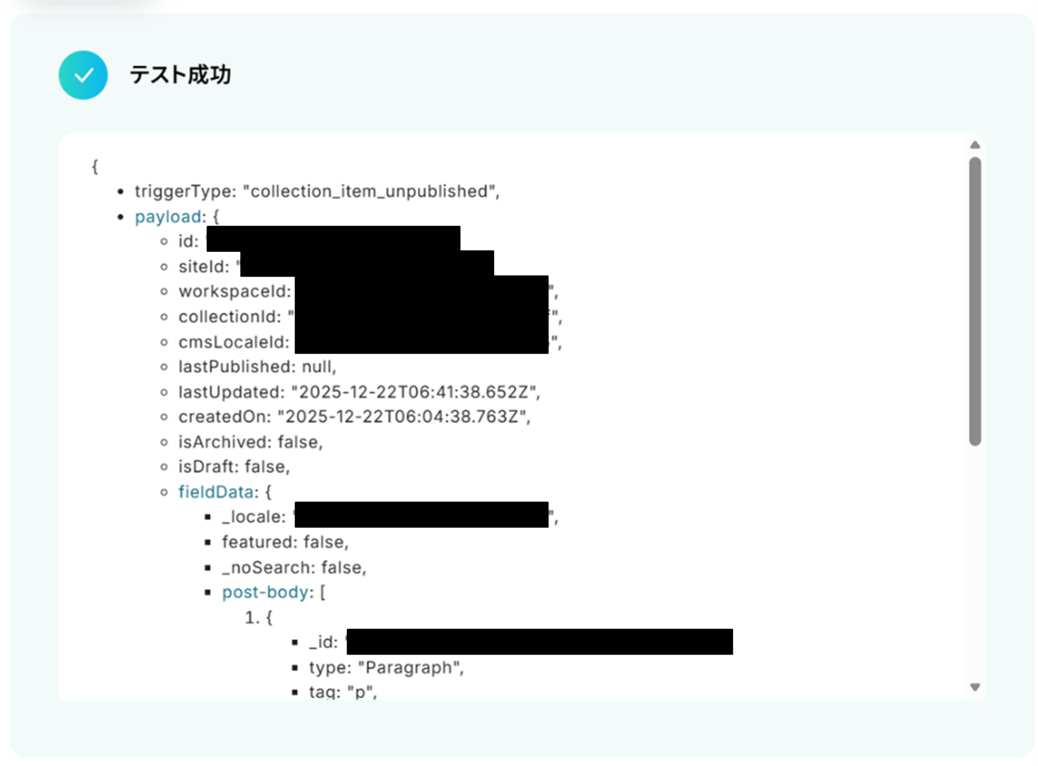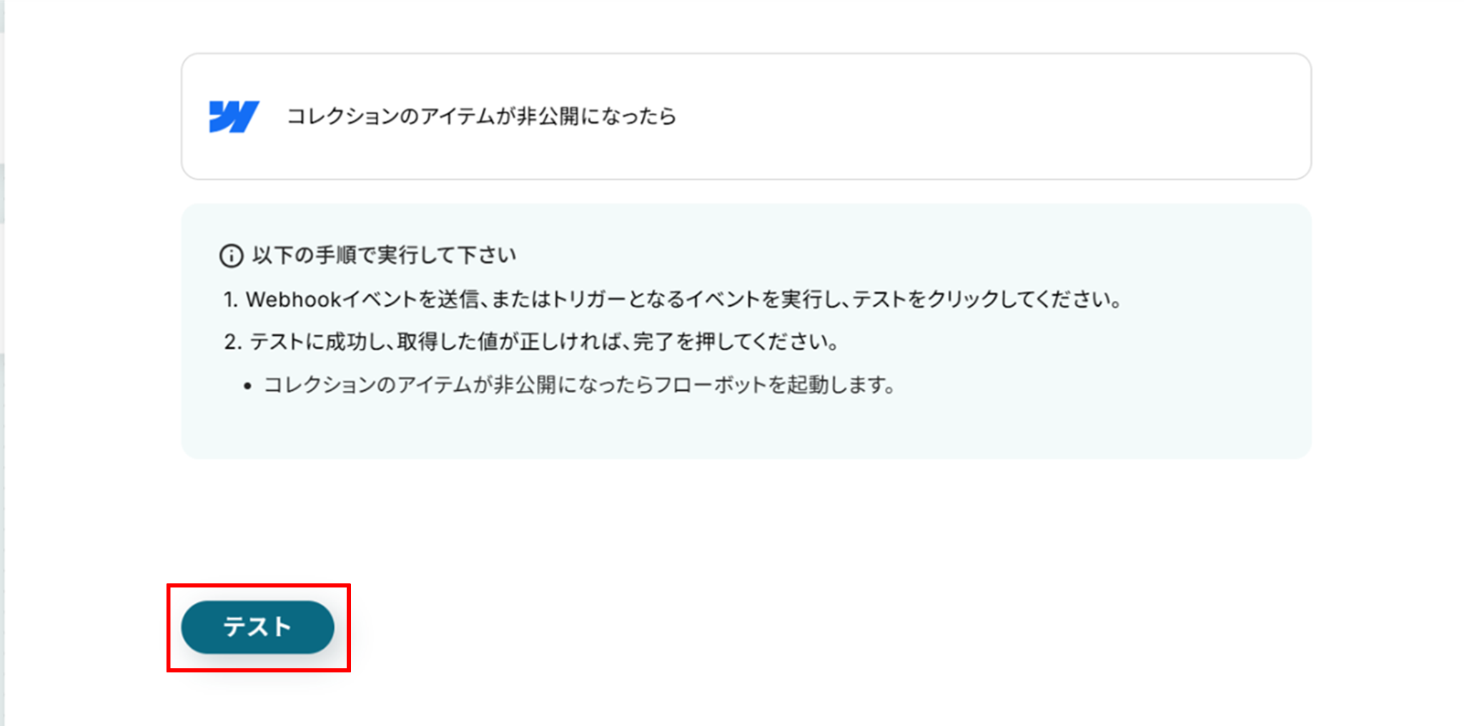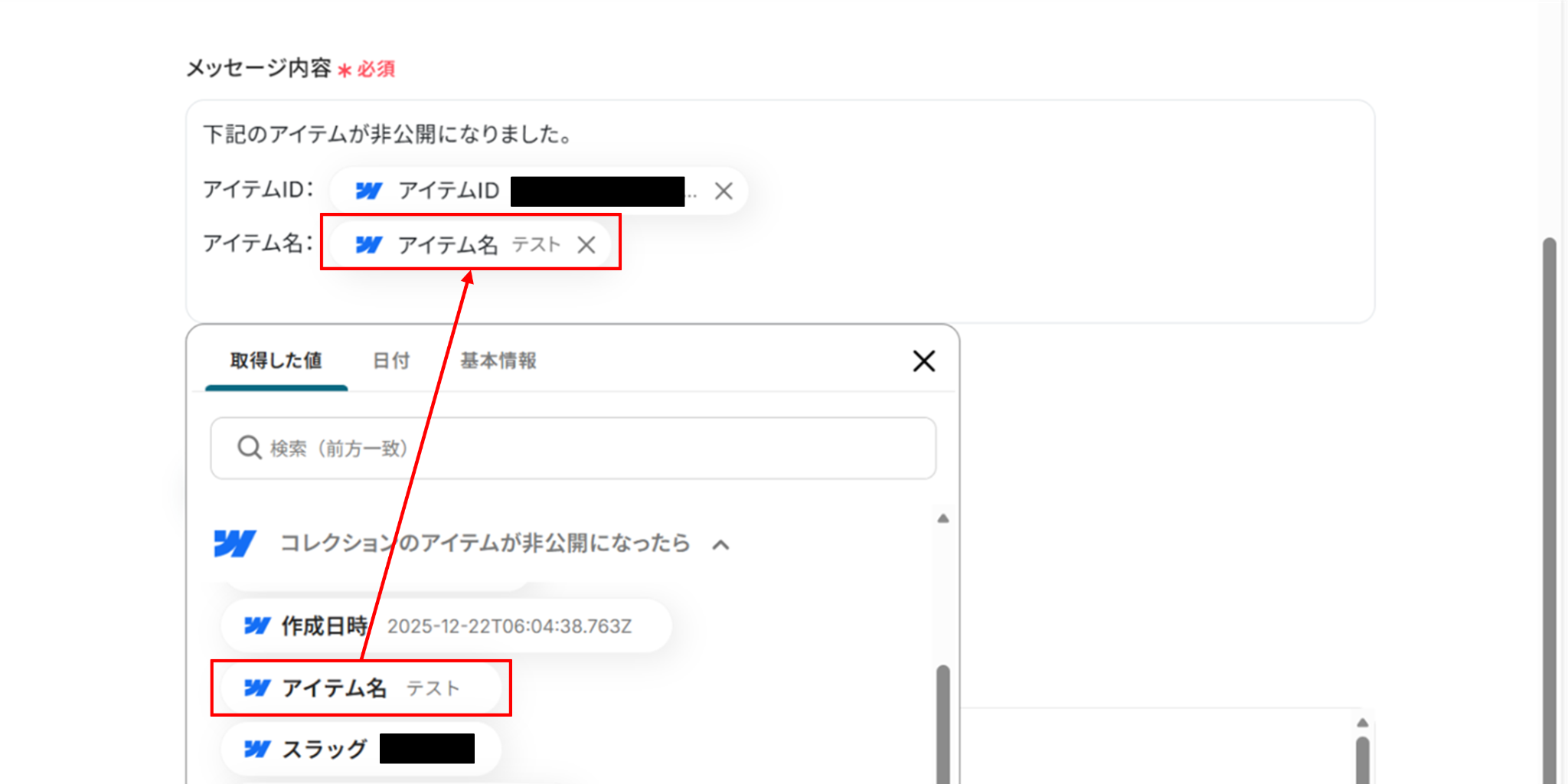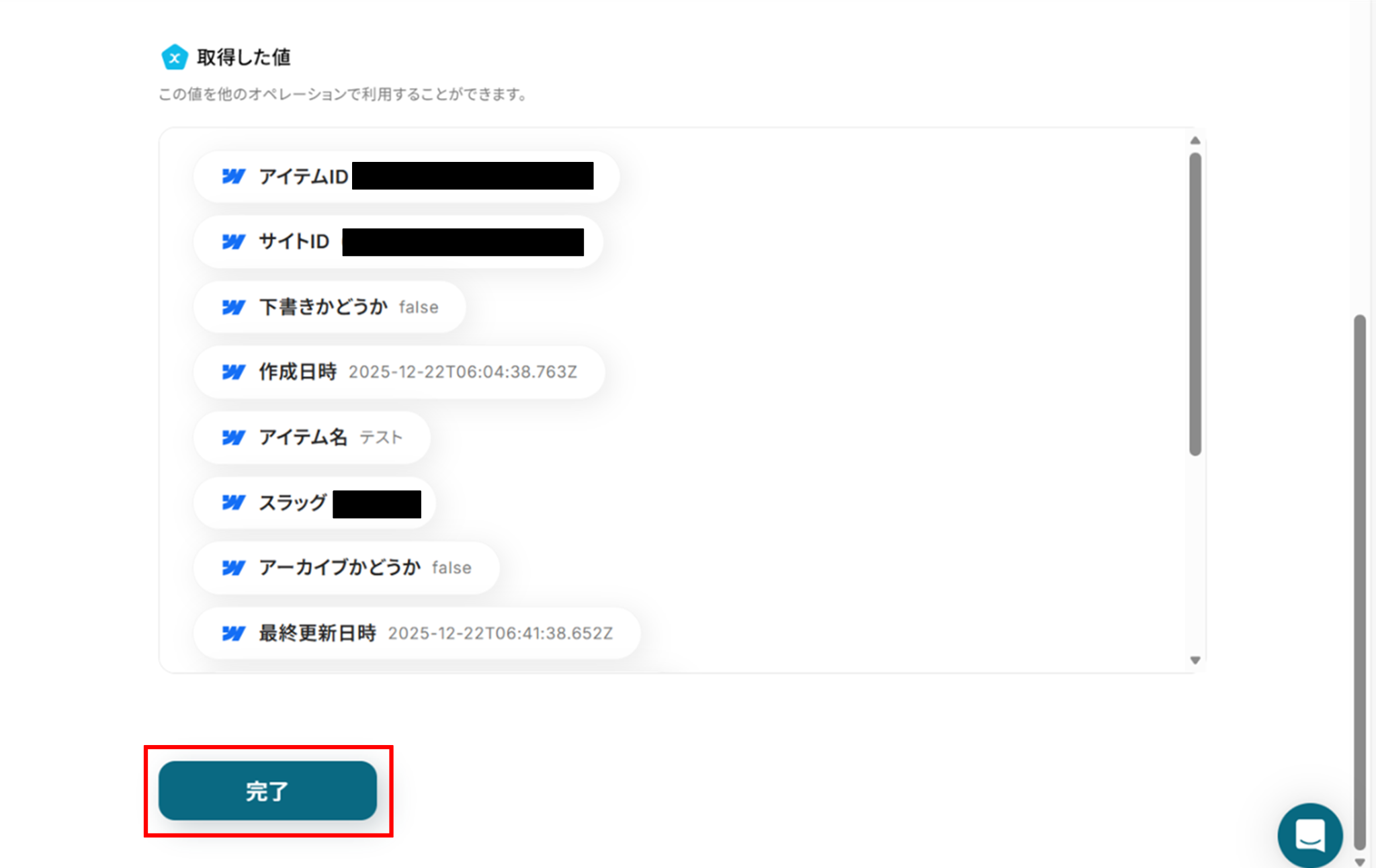 「取得した値」にWebflowの情報が反映されればテスト成功です。