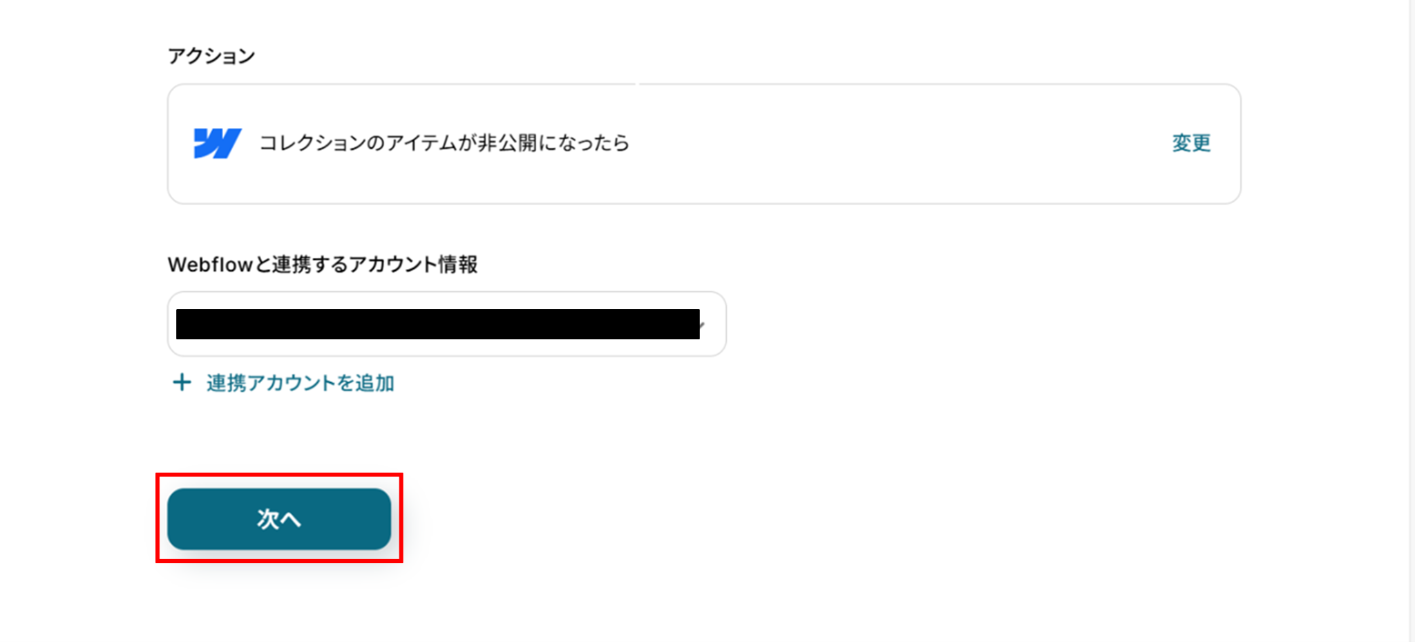 (2)「連携アカウントとアクションを選択」画面から、Webflowと連携するアカウント情報に誤りがないかを確認し、トリガーアクションは「コレクションのアイテムが非公開になったら」のままで「次へ」をクリックします。