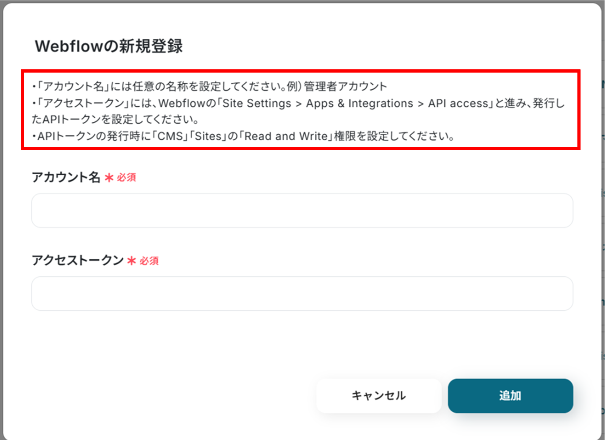 (2)「Webflowの新規登録」画面から赤枠を確認の上、アカウント名、アクセストークンを入力し「追加」をクリックします。