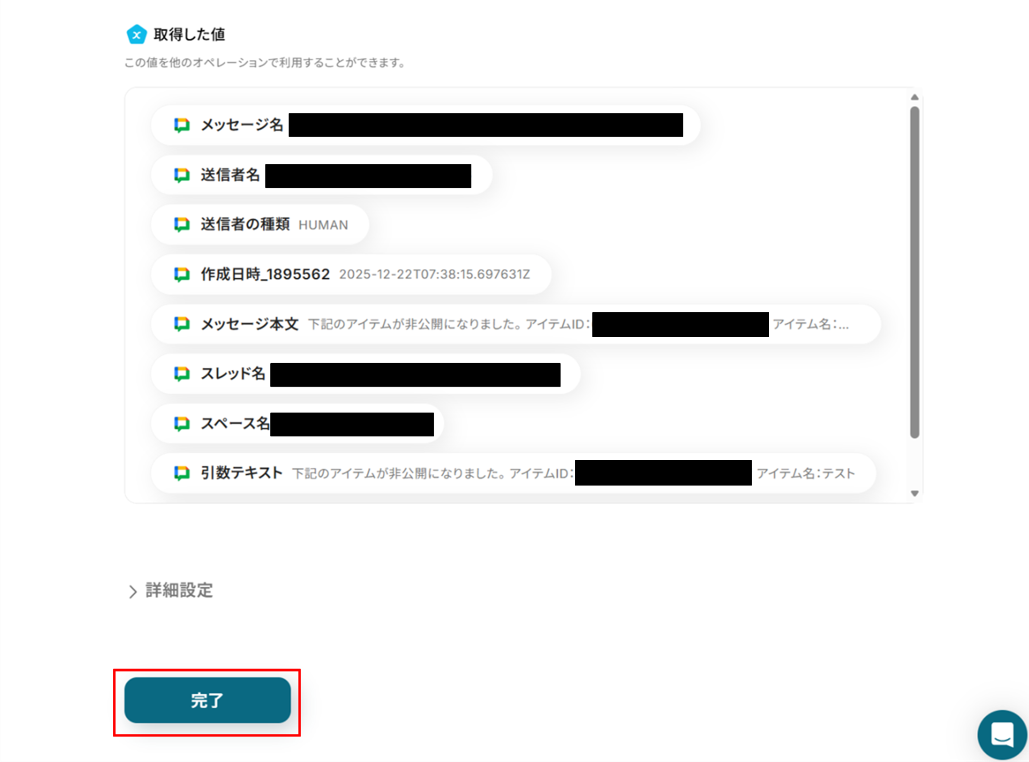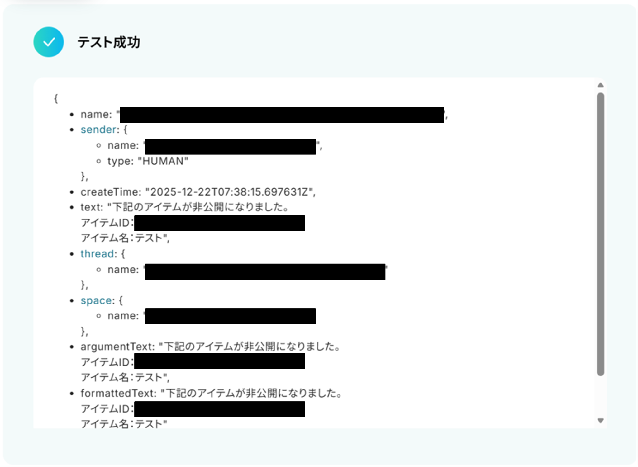 実際にフローボットを起動して、Webflowのコレクションのアイテムが非公開になったらGoogle Chatに通知されているかを確認してみてくださいね!