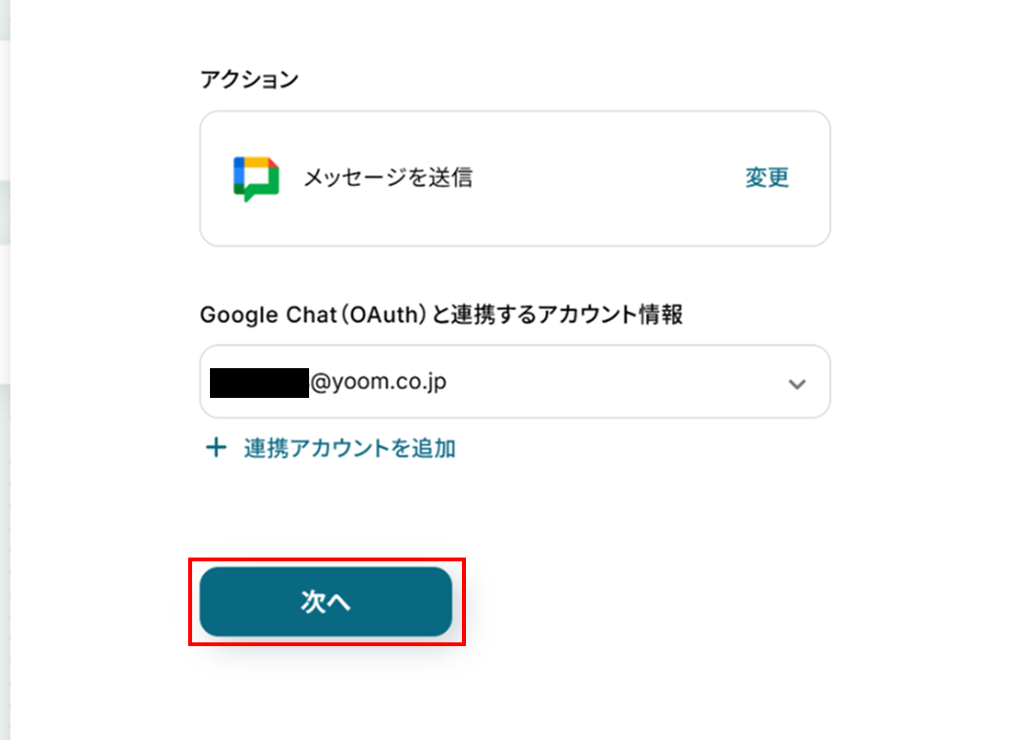 (2)「連携アカウントとアクションを選択」画面から、Google Chatと連携するアカウント情報に誤りがないかを確認し、アクションは「メッセージを送信」のままで「次へ」をクリックします。