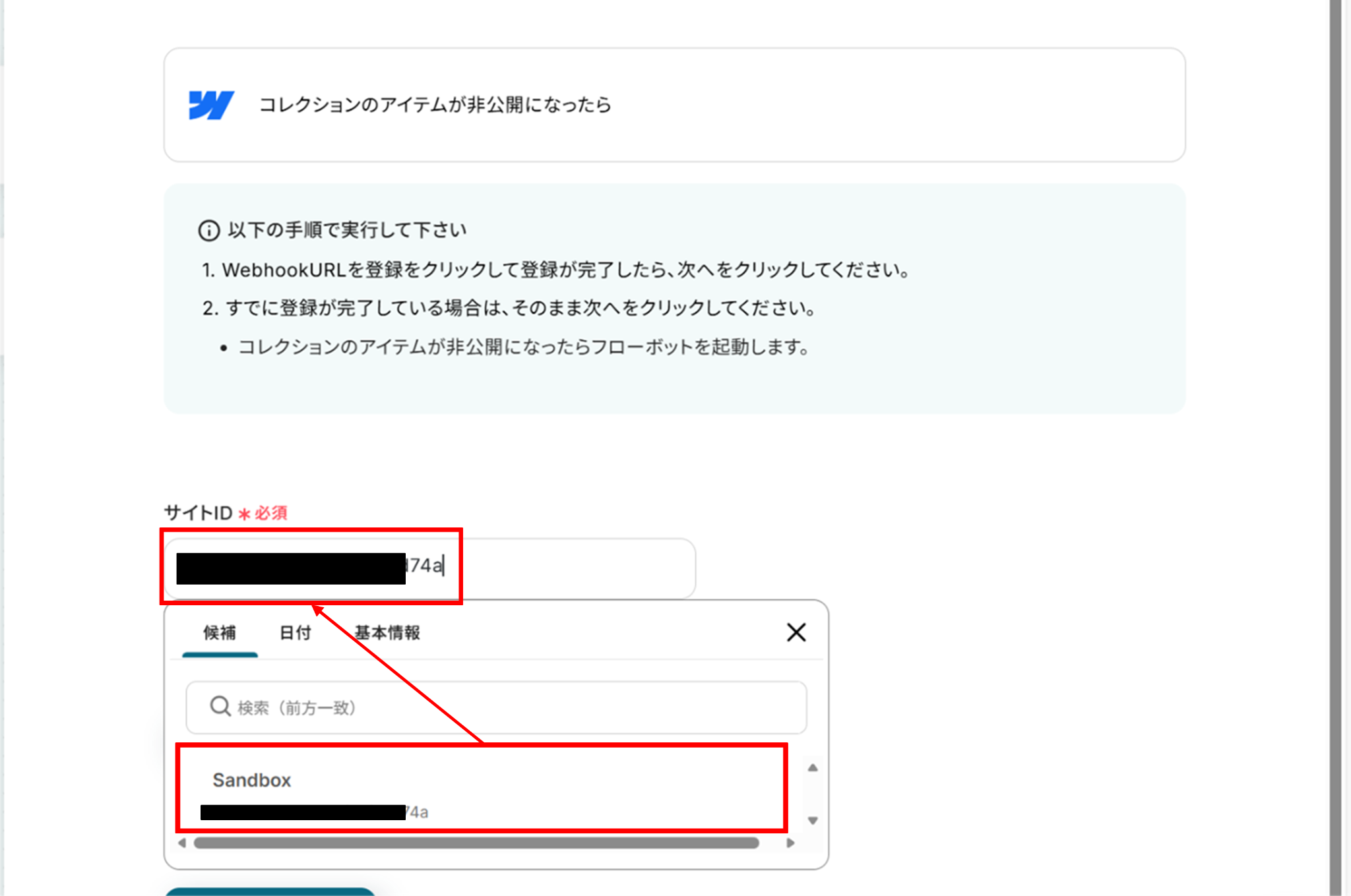 (3)サイトIDは候補から選択し、「WebhookURLを登録」をクリックします。