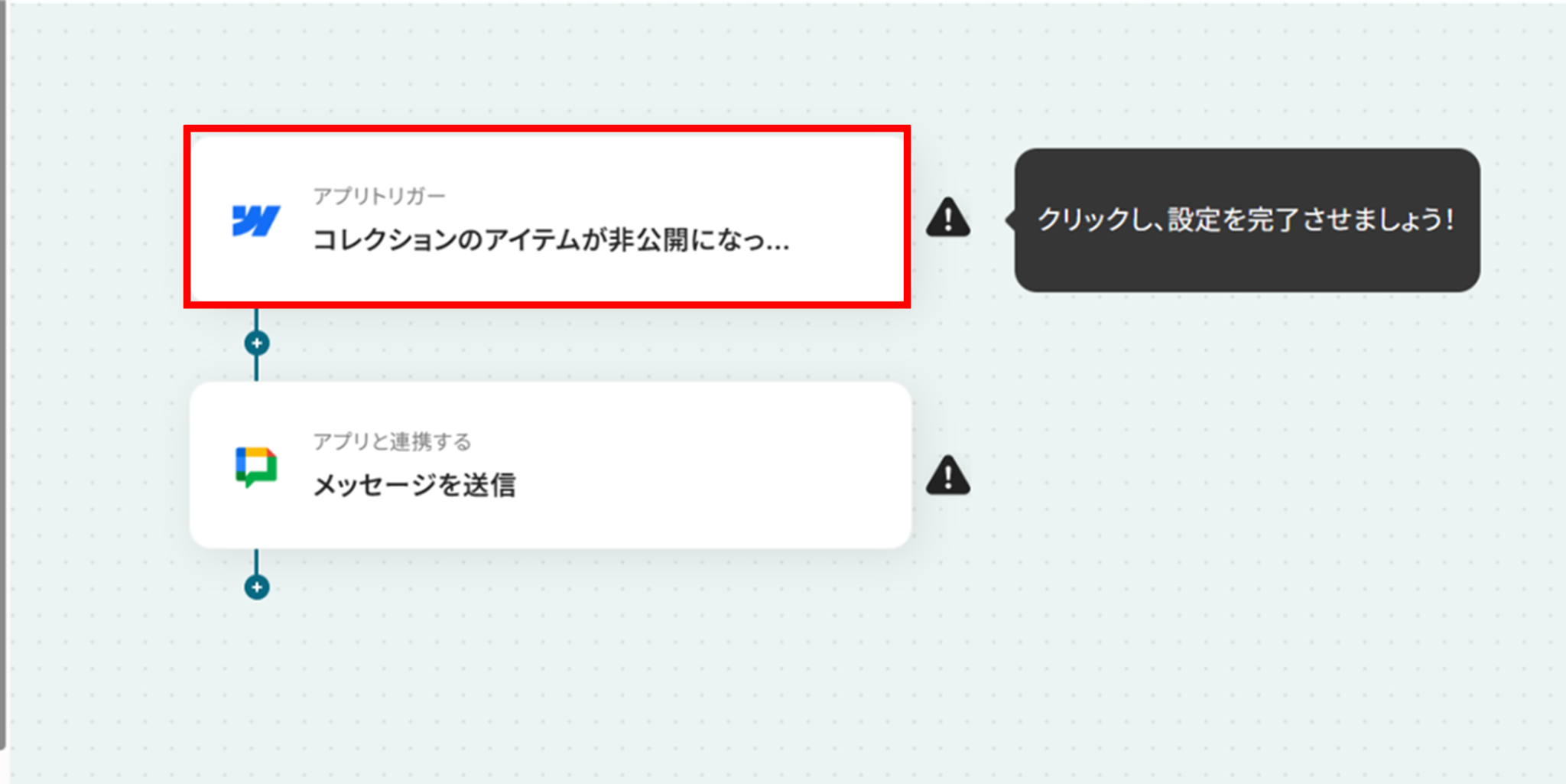このワークフローを活用すれば、Webflowでコレクションのアイテムが非公開になったタイミングを自動で検知しGoogle Chatへ通知を送信できます。これにより、重要な変更の見落としを防ぎ、迅速な対応を実現します。
