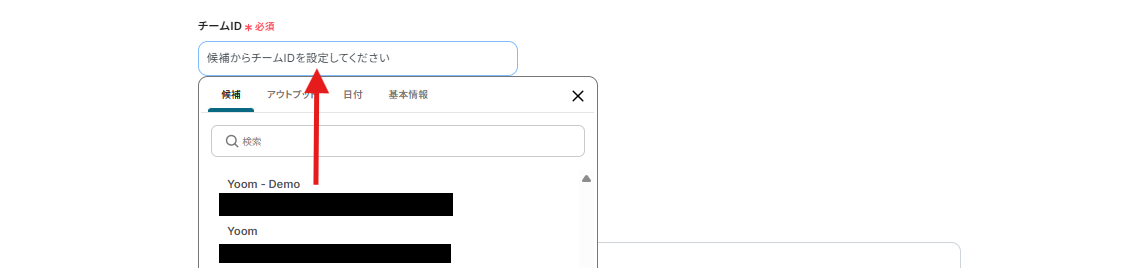 チームIDは、枠内をクリックすると候補が表示されるので、使用したいIDを任意で選択してください。