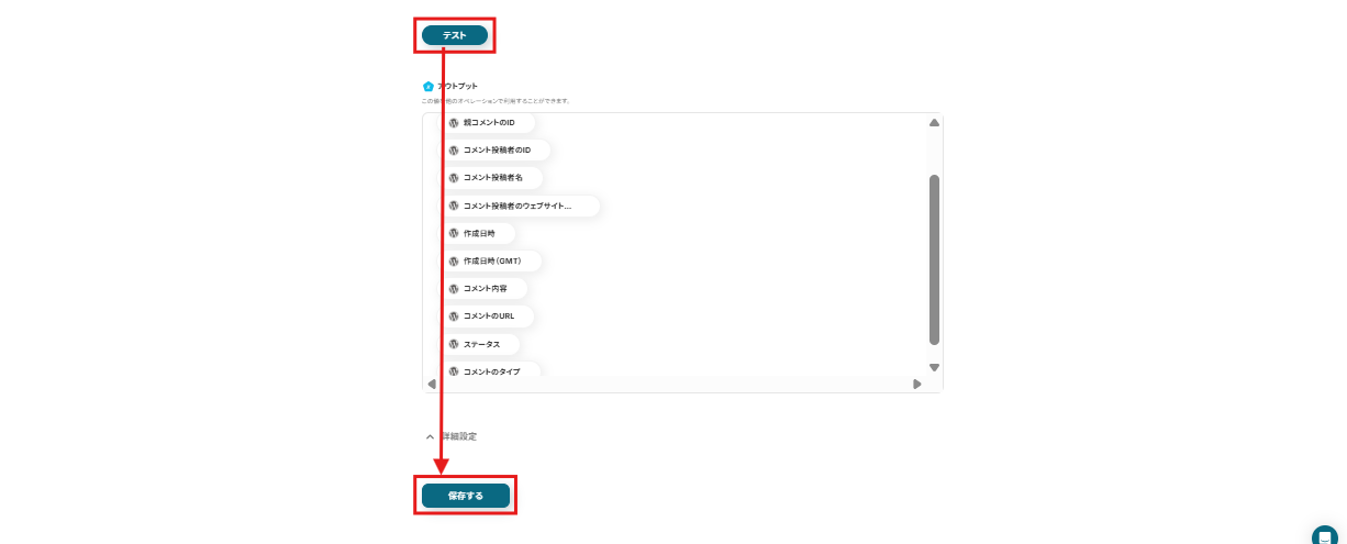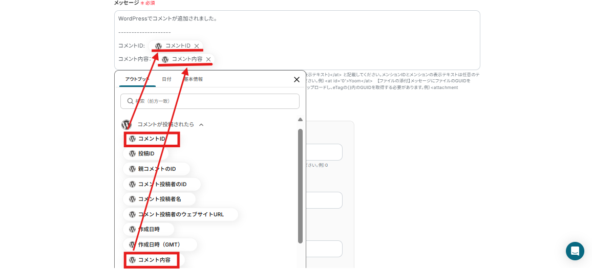 例えば、下記画面のように設定すると、WordPressでコメントが追加されたら「コメントID」「コメント内容」を自動で取得し、先ほど設定したMicrosoft Teamsに自動通知できますよ!
