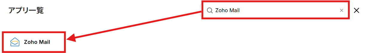 「新規接続」を選択すると「アプリ一覧」が表示されるので、Zoho Mailを検索して選択しましょう。