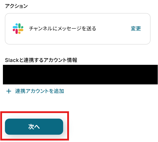 「Slackと連携するアカウント情報」を確認し、「次へ」をクリックして進んでください。