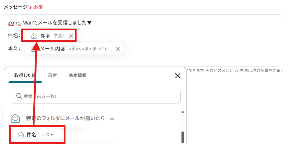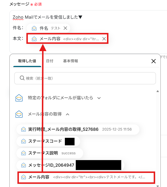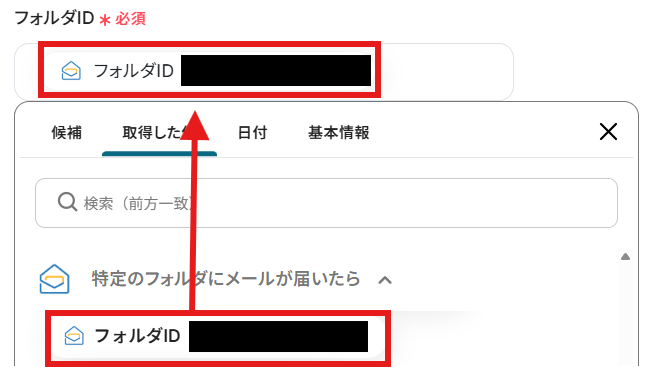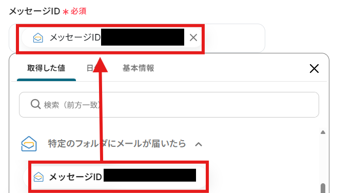 「フォルダID」と「メッセージID」を「取得した値」から設定します。
