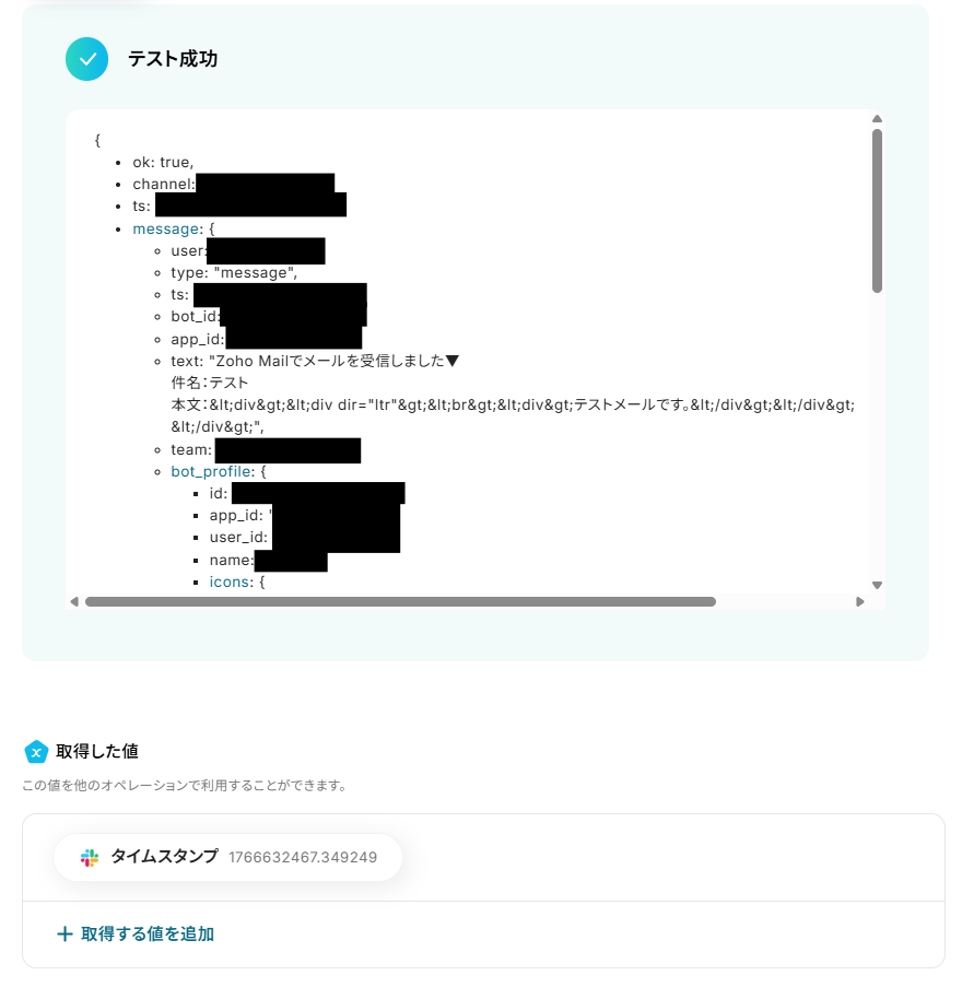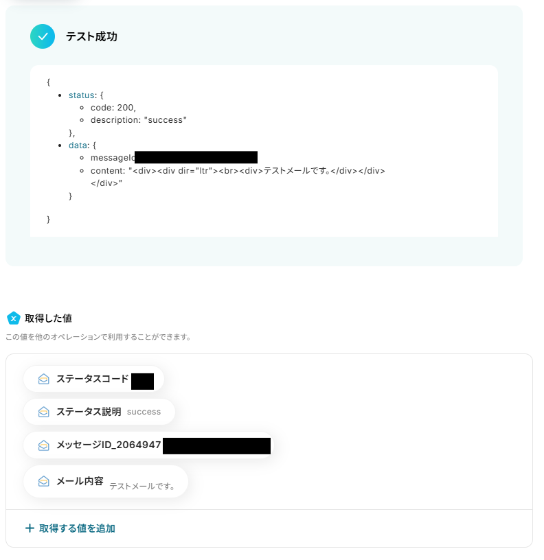 テストに成功すると「取得した値」に反映されます。詳しくは以下をご覧ください。