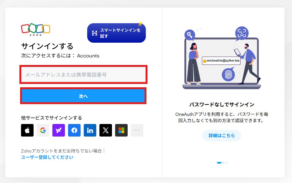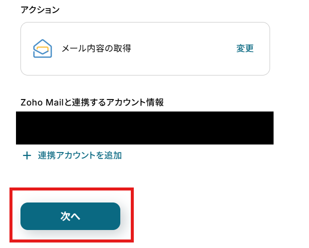 「Zoho Mailと連携するアカウント情報」を確認し、「次へ」をクリックして進んでください。