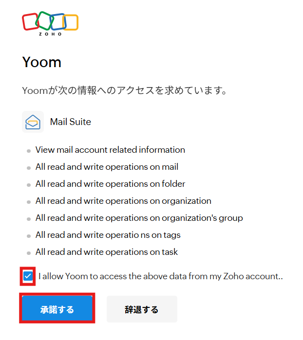 アクセス権限について確認したら、チェックボックスにチェックを入れて「承諾する」を選択しましょう。