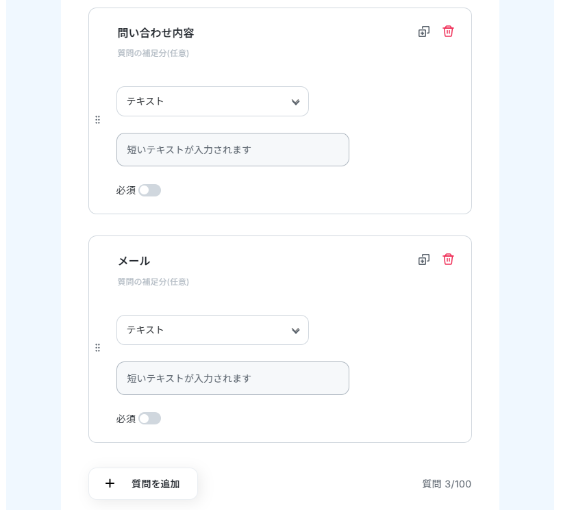 項目を追加したい場合は、+質問を追加をクリックし設定を行ってください。