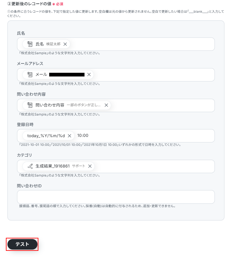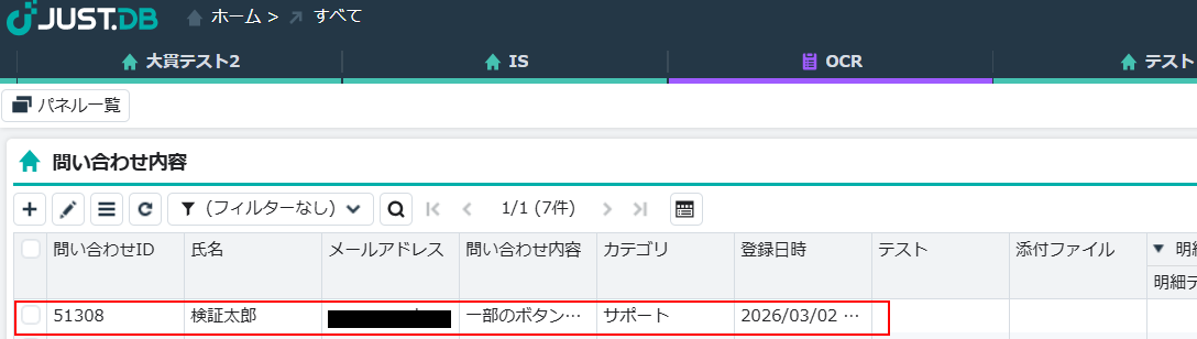 ※テストをクリックすると、実際にレコードが挿入されます。