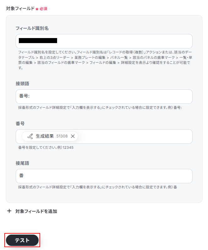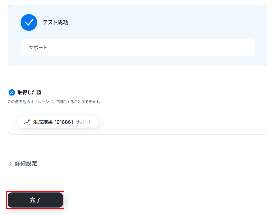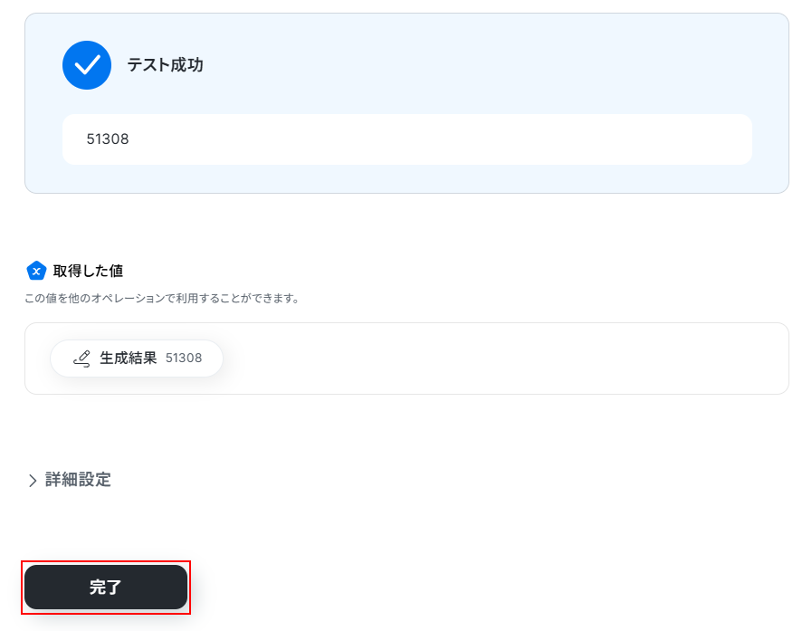 テストに成功するとテスト成功画面と取得した値に生成結果が表示されますのでご確認ください。