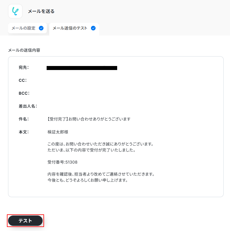 設定できたらテストをクリックしましょう。