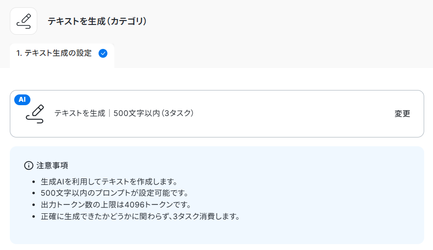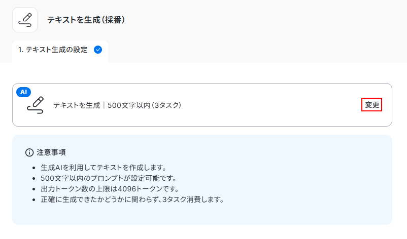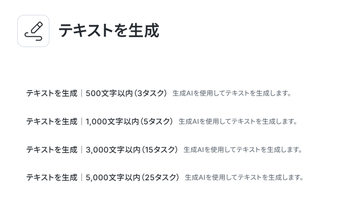 今回はデフォルトで設定されているテキストを生成 500文字以内(3タスク)を利用しますが、変更をクリックすることで別のものに変えることも可能です。