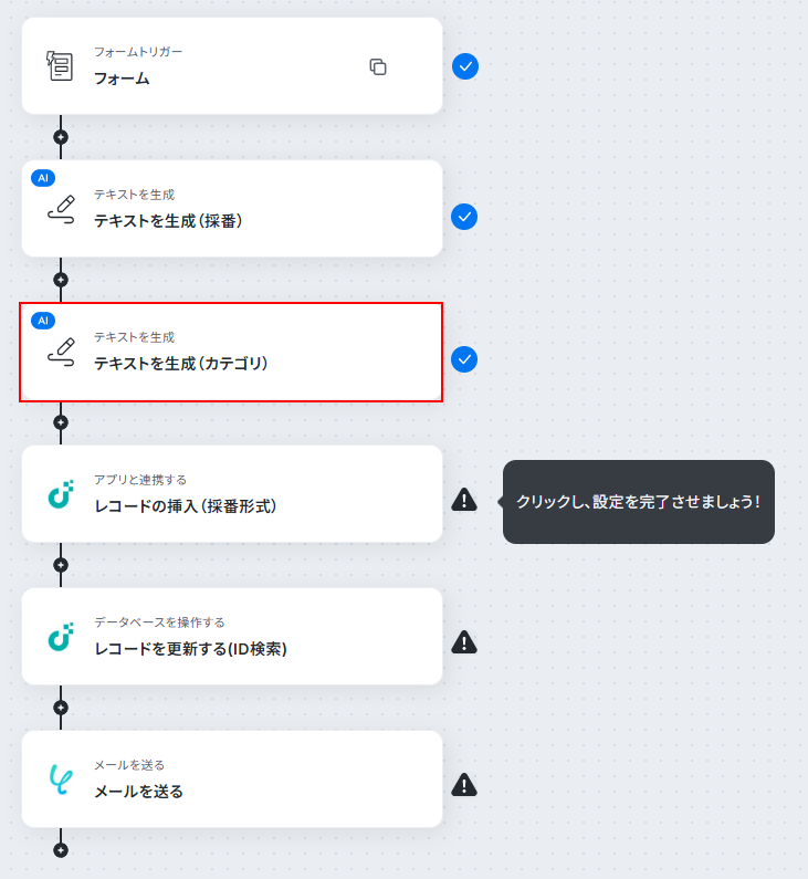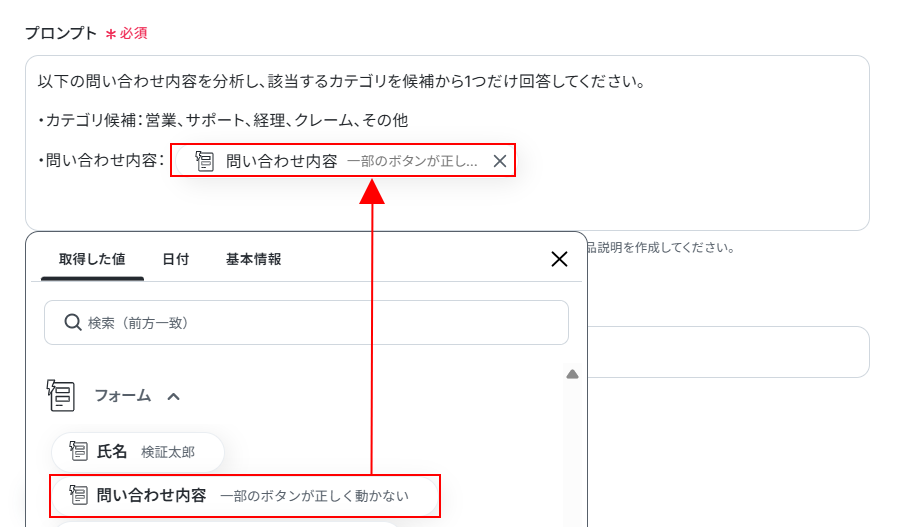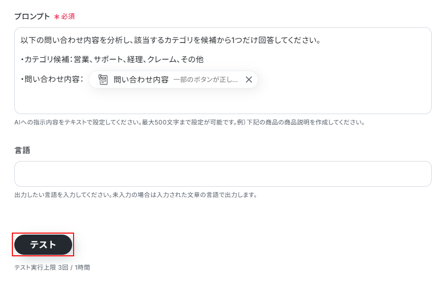 このステップでは、フォームで取得した問い合わせ内容から相応しいカテゴリを判断し、テキストとして生成します。