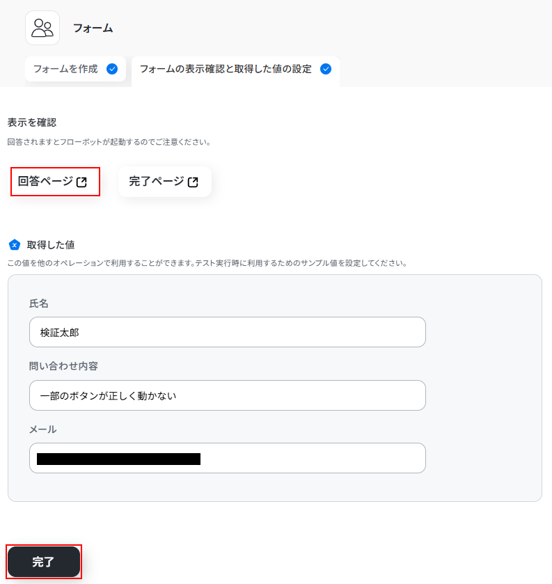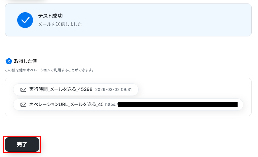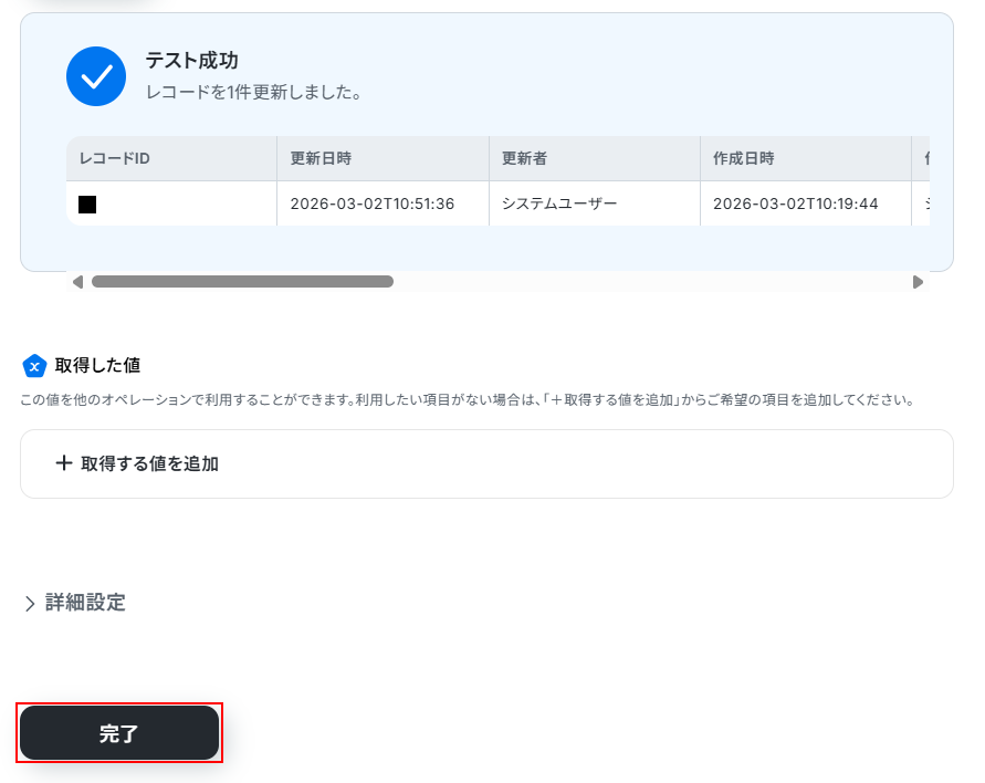 取得した値の項目にそれぞれ入力できたら完了をクリックしましょう。
