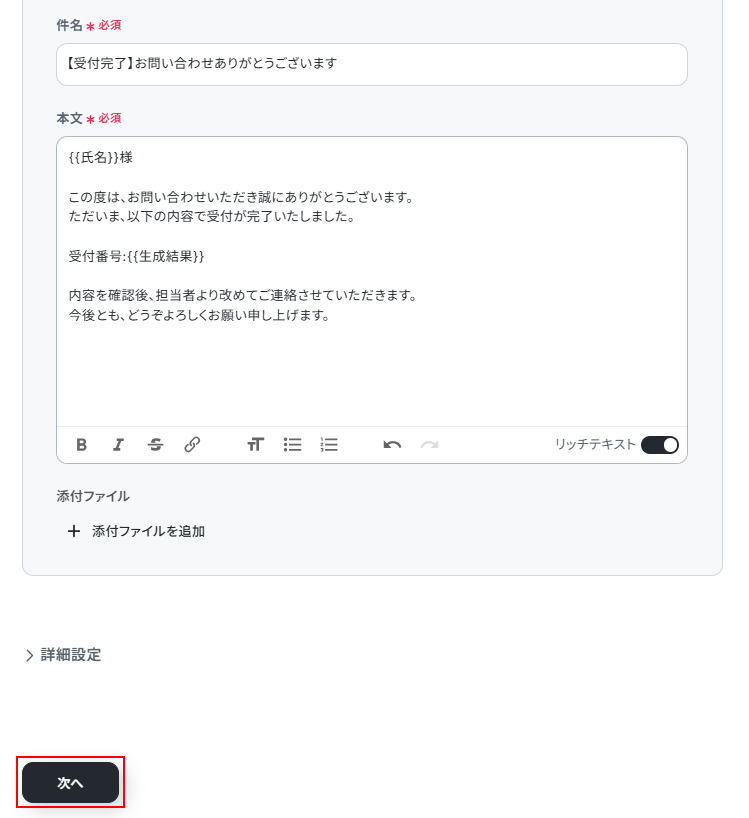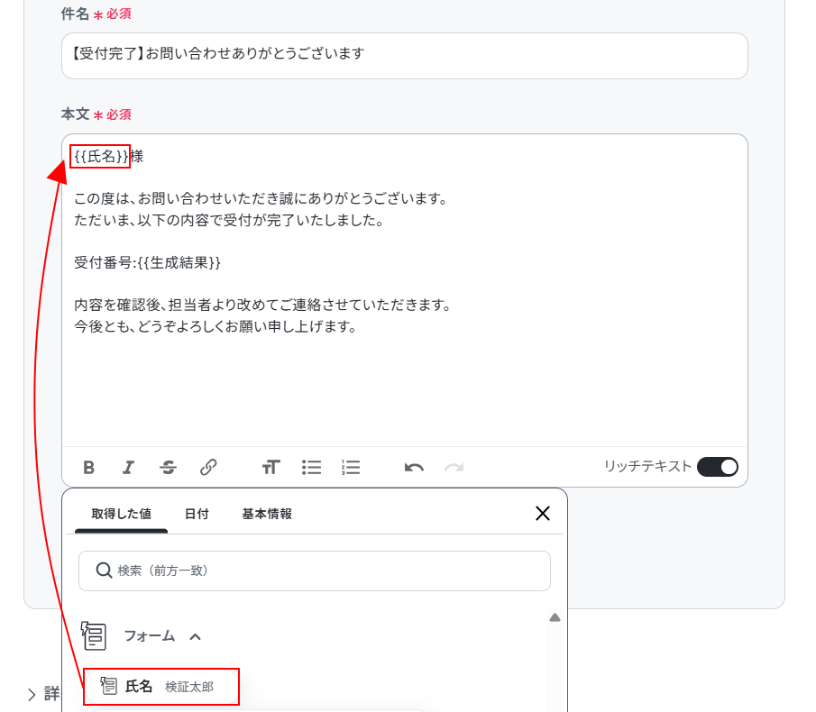 ※例えば、フォームの項目に新しい問い合わせIDとして利用したい情報を入力する項目を作成し、プロンプトを編集することで(取得した値として追加するなど)、規則性のある番号を生成することも可能です。