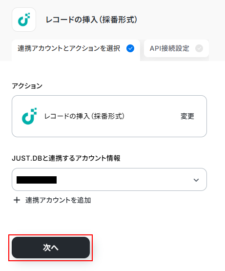 連携するアカウント情報にはステップ1で連携したアカウントか、連携時に使用していたYoomのアカウントが表示されます。