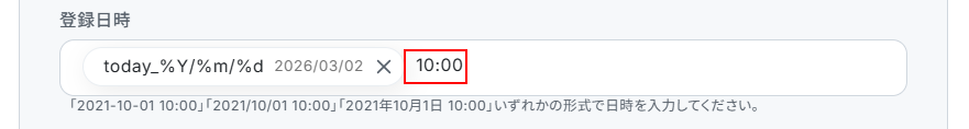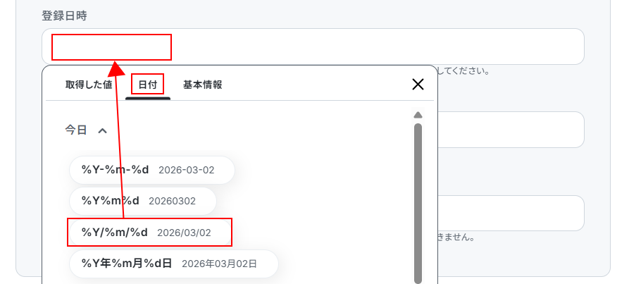 今回は登録日時の項目に動的な日付を設定します。