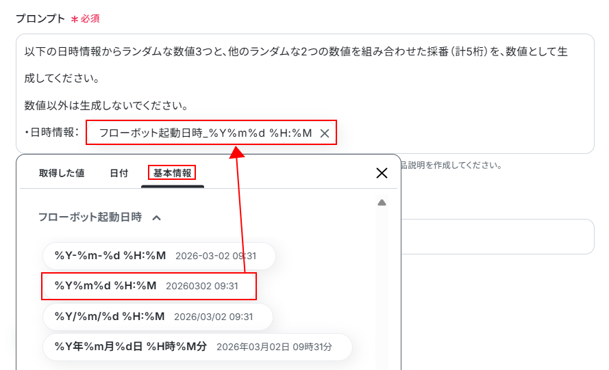 また、プロンプト内にはフローボットの起動日時が設定されています。