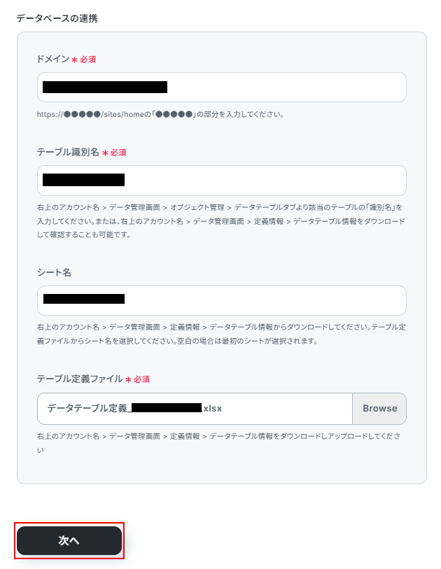 シート名、テーブル定義ファイルはそれぞれ注釈を確認して設定しましょう。