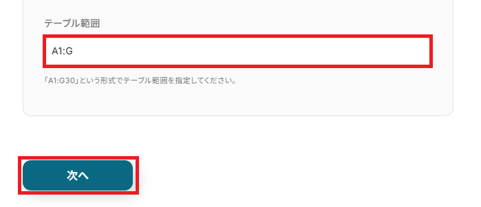 「テーブル範囲」は、作成したシートに合わせ直接入力してください。